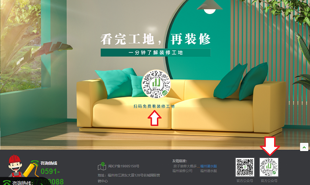 每個(gè)頁面的底部詳情信息內(nèi),除了咨詢電話、公司地址、友情鏈接,再加入工地二維碼,給到瀏覽者很好的觀感,如果有裝修需求,也會(huì)掃碼看看這個(gè)裝修公司的工地。