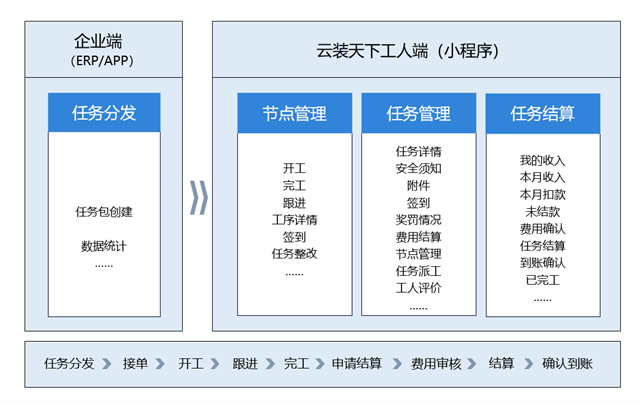 2、扁平化結(jié)算,企業(yè)端到工人端不再經(jīng)過層層剝削,降低裝企成本、提高工人收益,并且規(guī)避財(cái)務(wù)風(fēng)險(xiǎn);