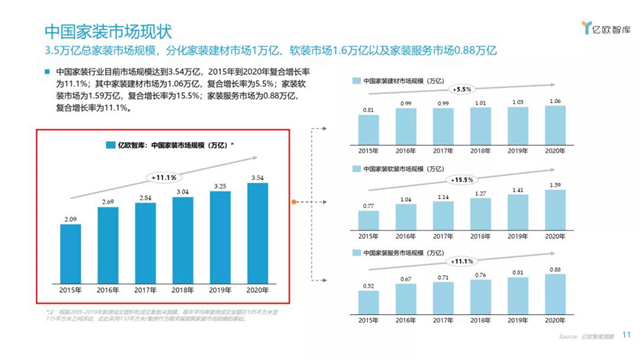 3.5萬(wàn)億總家裝市場(chǎng)規(guī)模分化家裝建材、軟裝市場(chǎng)及家裝服務(wù)。家裝服務(wù)市場(chǎng)增速明顯加快。