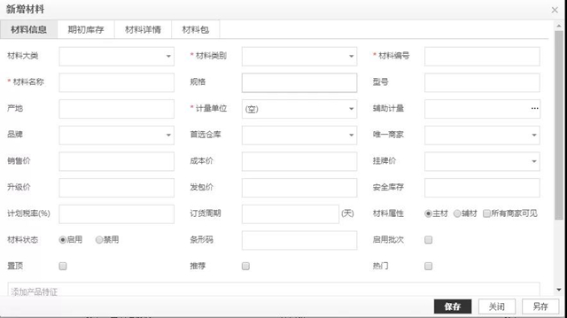 裝企在系統(tǒng)里的“材料寶典”錄入標(biāo)準(zhǔn)模式,包括材料大類、材料類別、材料編號、材料名稱等,材料員發(fā)起申購單時,可以直接選擇所需的材料,按需下定。如果遇到特別的材料,系統(tǒng)也支持自定義。