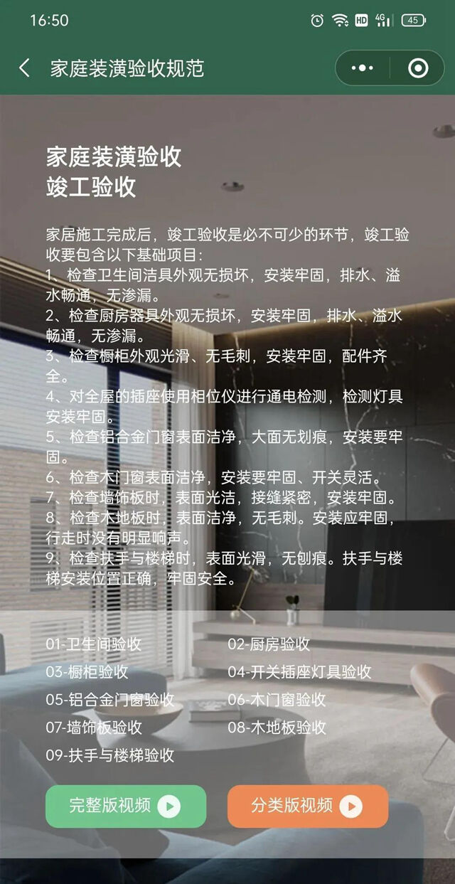 微信小程序搜索:家裝驗收報告,就可以看到水電驗收、泥木驗收、涂裝驗收、竣工驗收四大流程的視頻驗收標準。