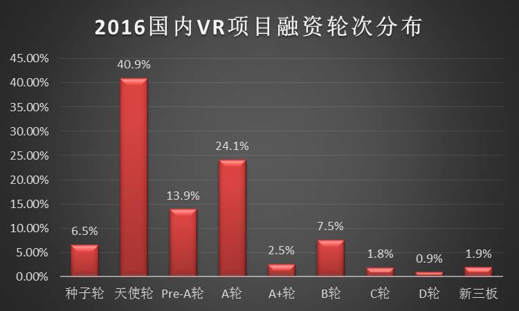 對于創(chuàng)業(yè)者來說,VR早已成為大部分人心中的風(fēng)口。近幾年VR行業(yè)的創(chuàng)業(yè)者倍增。其中跑的比較快的團隊和公司,已經(jīng)開始進入B輪以后,而大部分公司主要集中在A輪以前,其中比例最大的是獲得天使輪融資的團隊或公司,占比達到40.9%。不難發(fā)現(xiàn),國內(nèi)的VR企業(yè)們尚處在初級階段,但由于VR本身的市場潛力很受資本看中,所以一直發(fā)展較快,預(yù)計今年過后,大部分的VR企業(yè)將進入B輪。