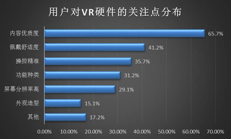 用戶對于VR設(shè)備的關(guān)注度與日俱增。在VR硬件設(shè)備的關(guān)注點分布圖中我們可以發(fā)現(xiàn),用戶最關(guān)心的還是內(nèi)容。幾乎絕大多數(shù)的用戶都對VR內(nèi)容的多樣性、優(yōu)質(zhì)程度抱有較大關(guān)注。和一般的視頻內(nèi)容不同,由于VR內(nèi)容的制作要求比較高的技術(shù)和成本,所以國內(nèi)的VR內(nèi)容并不是十分成熟,當(dāng)前已經(jīng)有越來越多的創(chuàng)業(yè)團隊傾注在此,相信優(yōu)質(zhì)的爆款內(nèi)容出現(xiàn)后,將會大大提升用戶對于虛擬現(xiàn)實的認(rèn)知。
