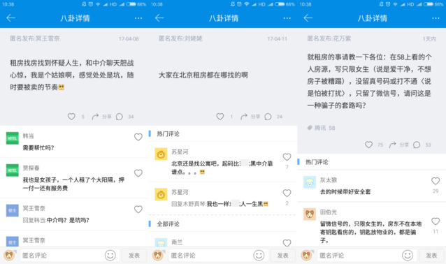 二是58同城、豆瓣、閑魚等個人發(fā)布租房的信息平臺。這類信息平臺是用戶去的最多的地方,但平臺上到處是中介發(fā)的房源,分不清是個人發(fā)的真房源,還是中介發(fā)的假房源。比如58同城上,中介會發(fā)假的、價格低的房源吸引用戶聯(lián)系,用戶聯(lián)系后就說這個房源沒了,然后帶用戶到處看房,這已經(jīng)是個泛濫的套路了。從很多社區(qū)里的吐槽建議來看,口碑最好的租房平臺居然是豆瓣小組,因?yàn)槎拱晟险嫒讼鄬Χ嘁恍?