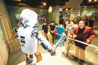 一月三十一日,寧夏科技館推出“聞雞起舞鬧新春”春節(jié)科普活動?!澳晁卓破铡薄叭斯ぶ悄堋钡榷囗椫黝}展覽吸引市民前來參觀。圖為觀眾在觀看機器人表演。