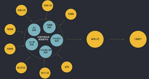 以打扮家為例,通過打造云端可視化信息系統(tǒng),可以連接設(shè)計(jì)、施工、生產(chǎn)商(經(jīng)銷商)、干線運(yùn)輸、倉儲配送、安裝服務(wù)等各環(huán)節(jié),提高整個生態(tài)圈的信息透明度、流暢度、協(xié)作效率及用戶體驗(yàn)。